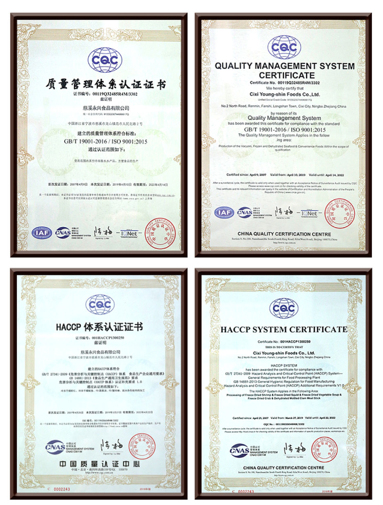 公司已通(tōng)過IS09001國(guó)際質量管理(lǐ)體(tǐ)系、HACCP食品安全控制(zhì)體(tǐ)系認證,産品獲得(de)了(le)€食品生(shēng)産許可(kě)證(QS)和(hé)出口食品生(shēng)産企業(yè)備案證,确保了(le)産品的(de)質量安全,并在200∏4年(nián)獲得(de)甯波市(shì)級農(nóng)業(yè)龍頭企業(yè)稱号,并且擁有(yǒu)£完備的(de)産品檢驗中心、産品研發中心和(hé)先進生(shēng)産流水(shuǐ)線。目前可(kě)出口的(de)國≤(guó)家(jiā)為(wèi)日(rì)本、韓國(guó)、中國(guó)香港地(dì)區(qū)、泰國(guó)、越南(ná n)和(hé)印度。